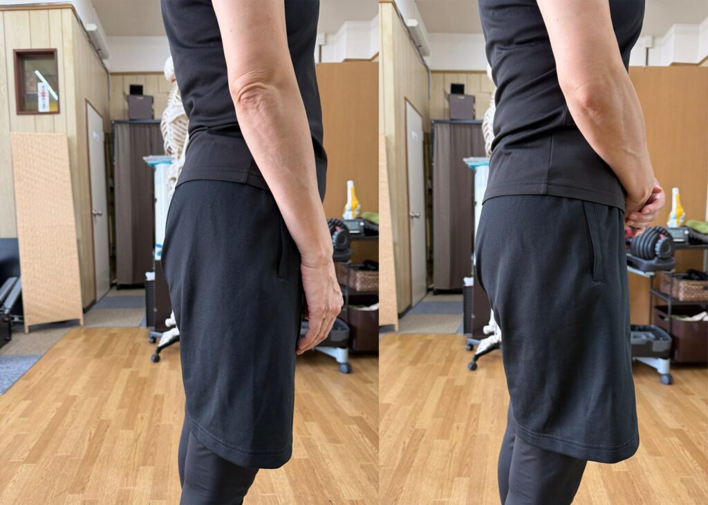 左の写真は腰の部分が反っていて、右の写真と比べるとお尻のラインも平たんに見えます。